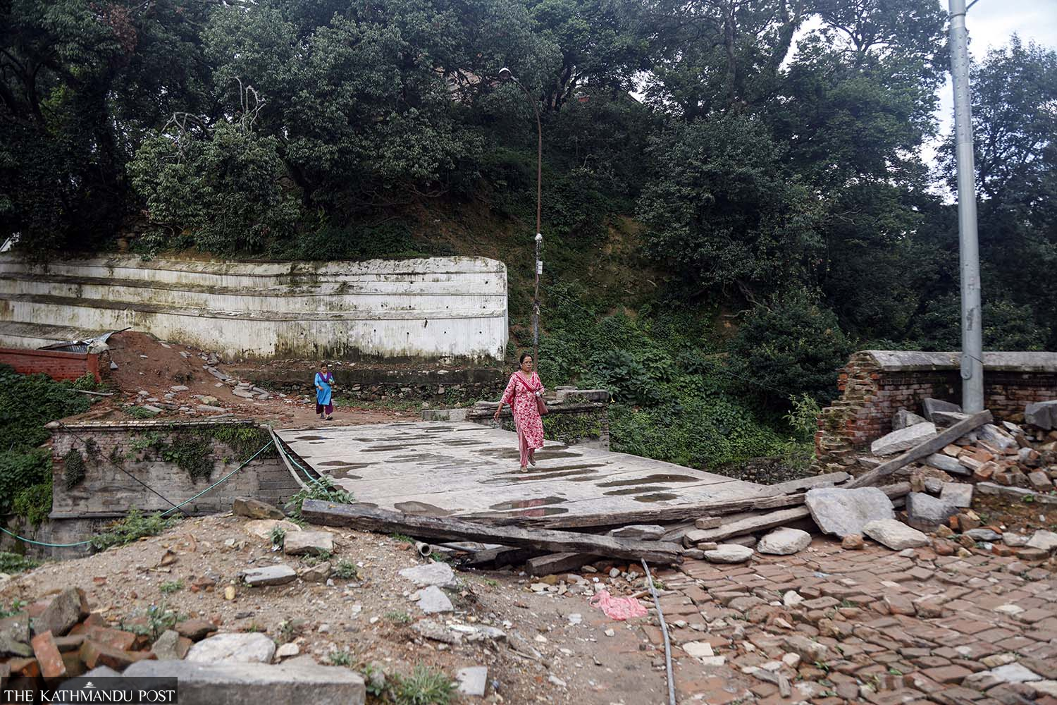 Women cross the dilapidated Gaurighat bridge in Kathmandu on Tuesday. A dispute over tender has left the structure, damaged in the 2015 earthquakes, in a state of disrepair. Suryams Upreti/TKP