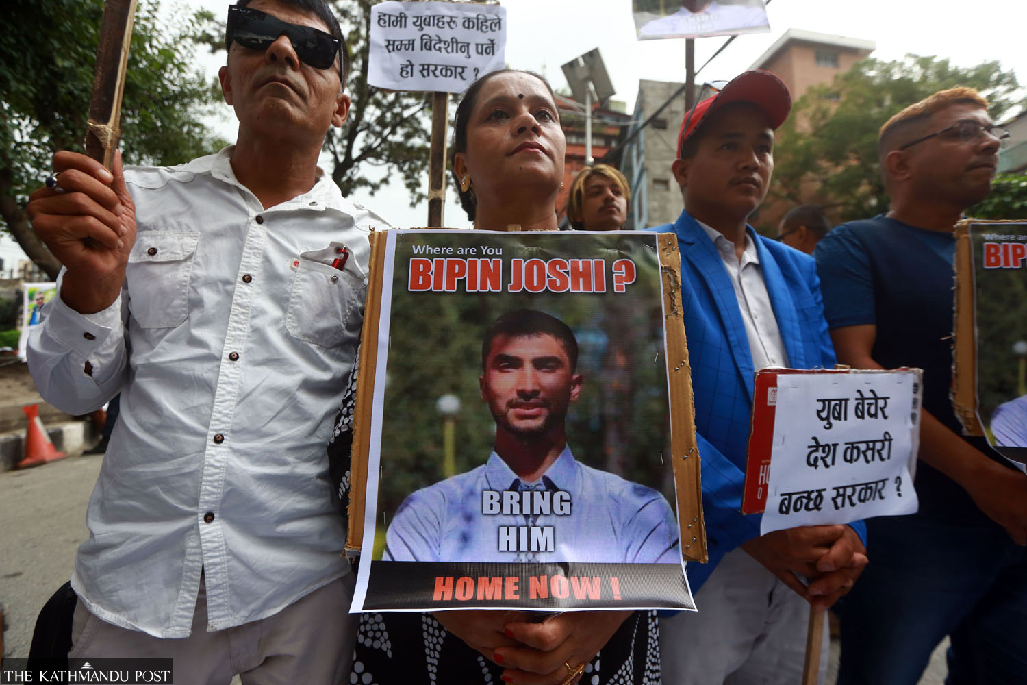 Activists stage a demonstration at Maitighar in Kathmandu to pressure the government to ensure safe release of Nepali student Bipin Joshi, who is believed to be in Hamas captivity ever since the terrorist organisation’s attack on Israel on October 7, 2023. Joshi’s mother and sister are currently in Israel calling for his release. Dipen Shrestha/TKP