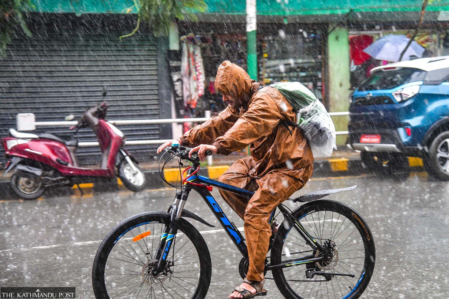 A cyclist makes his way through rain in New Baneshwar, Kathmandu, on Monday afternoon. Deepak KC/TKP