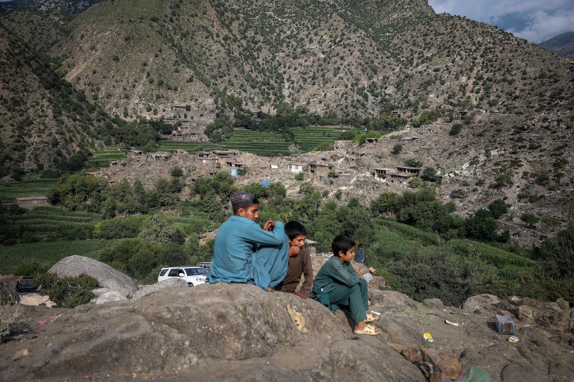 Afghan children sit on a hill with the devastated village of Mazar Dara in the background, after a deadly magnitude-6 earthquake that struck Afghanistan, in Kunar province, Afghanistan, September 2. Reuters
