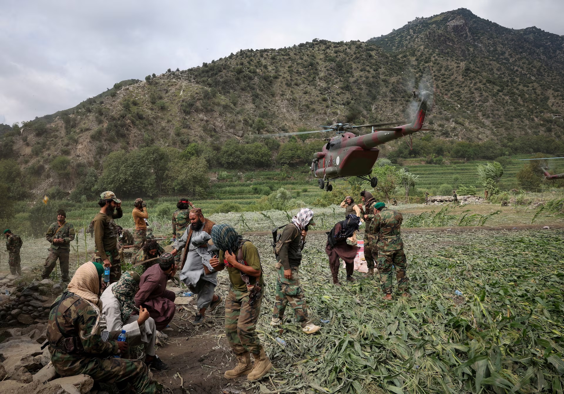 A Taliban military helicopter carries injured victims of a deadly magnitude-6 earthquake that struck Afghanistan, in Mazar Dara, Kunar province, Afghanistan, September 2. Reuters