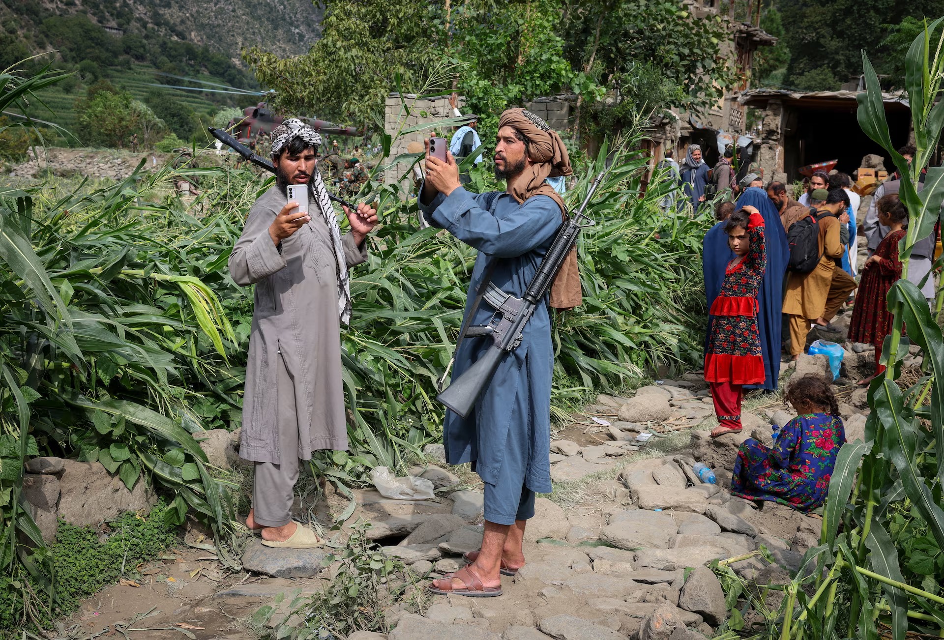 Members of Taliban take pictures of the devastated village of Mazar Dara following a deadly magnitude-6 earthquake that struck Afghanistan, Kunar province, Afghanistan, September 2. Reuters