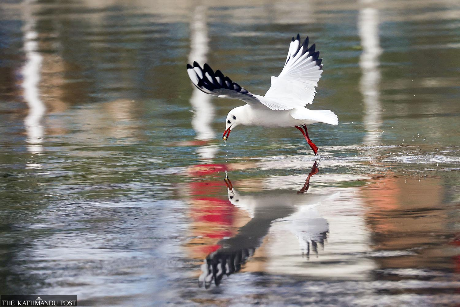 A black-headed gull with food on its beak is seen in the Bagmati River at Kupandole on Monday. Flocks of these migratory visitors have been spotted around the rivers and water bodies of the Kathmandu Valley in recent days. These sea birds travel from the frozen north to winter in Asia’s warmer climes. They feed mainly on insects, seeds, worms, and carrion. Hemanta Shrestha/TKP