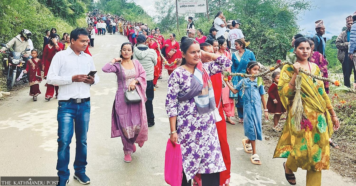 Devotees carry Toran, a flower-studded grass twine, to be stretched across the Kaligandaki river at Rampur on the border of Palpa and Syangja, on Saturday. This ritual is significant as a form of worship for Vishnu, who is believed to wake up after a long sleep on Haribodhini Ekadashi. The river is famous for the fossil rock Shaligram, one of the forms the Hindu lord is believed to take. Madhav Aryal/TKP
