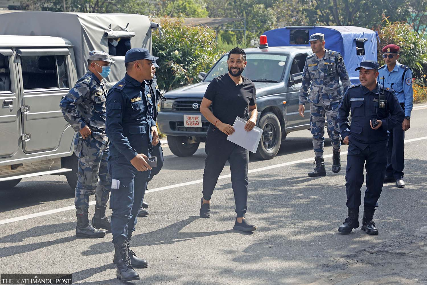Rastriya Swatantra Party chief Rabi Lamichhane, who is in judicial custody for cooperative fraud, is brought to Singha Durbar for questioning on Wednesday in connection with his alleged escape from Nakkhu jail on September 9. He claimed he had been freed by jail officials. Hemanta Shrestha/TKP