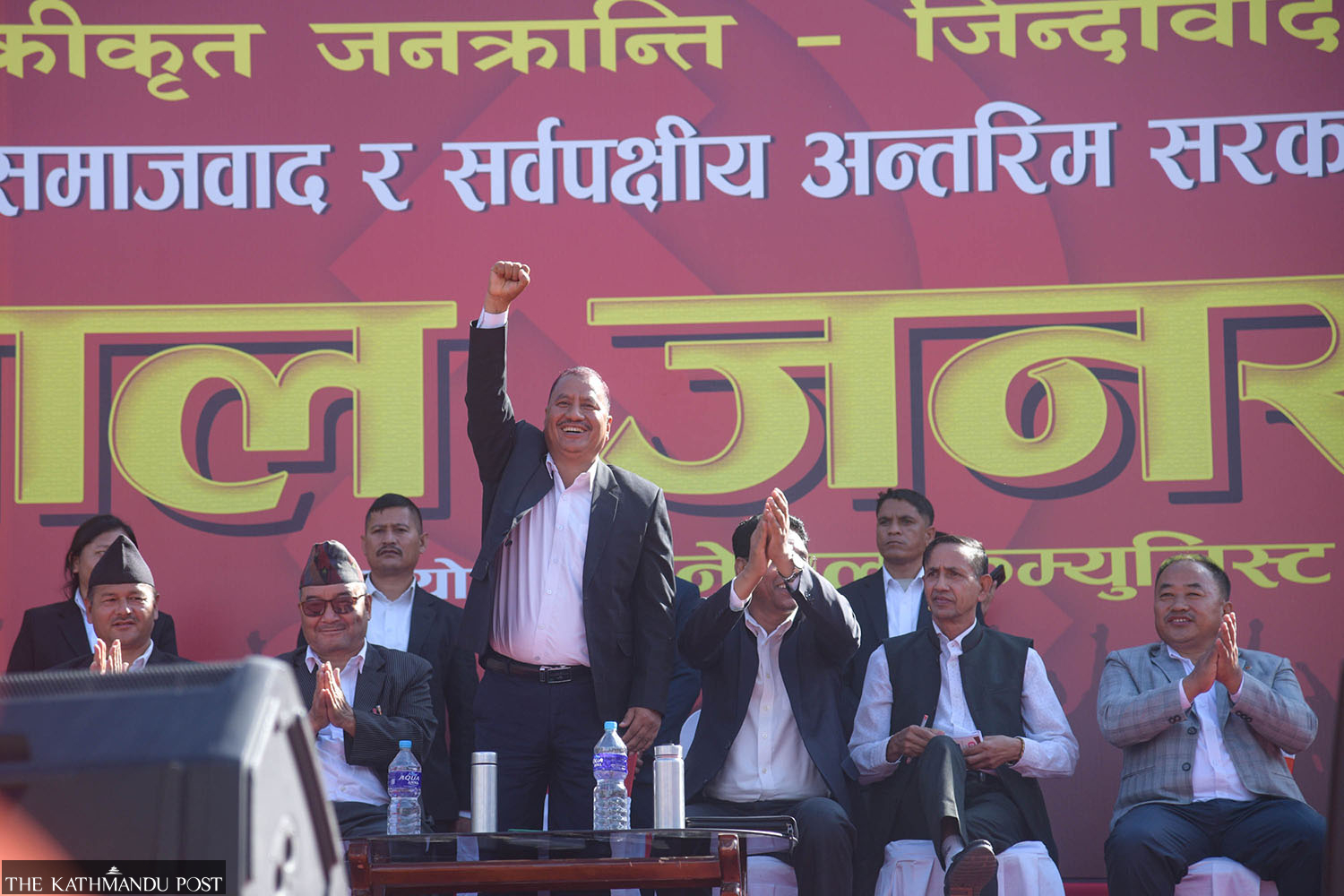 General Secretary Netra Bikram Chand of Nepal Communist Party greets his party members at a mass meet of the party in Kathmandu on Thursday. Deepak KC/TKP