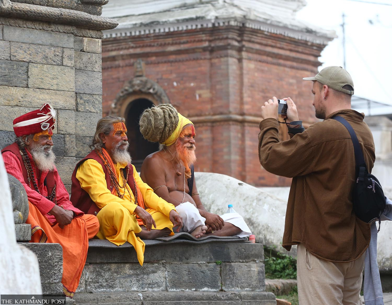 Sadhus with painted faces, and draped in sacred hues of saffron, red, and yellow pose for a foreign tourist in the Pashupati area inKathmandu. This picture was taken last week. Dipen Shrestha/TKP