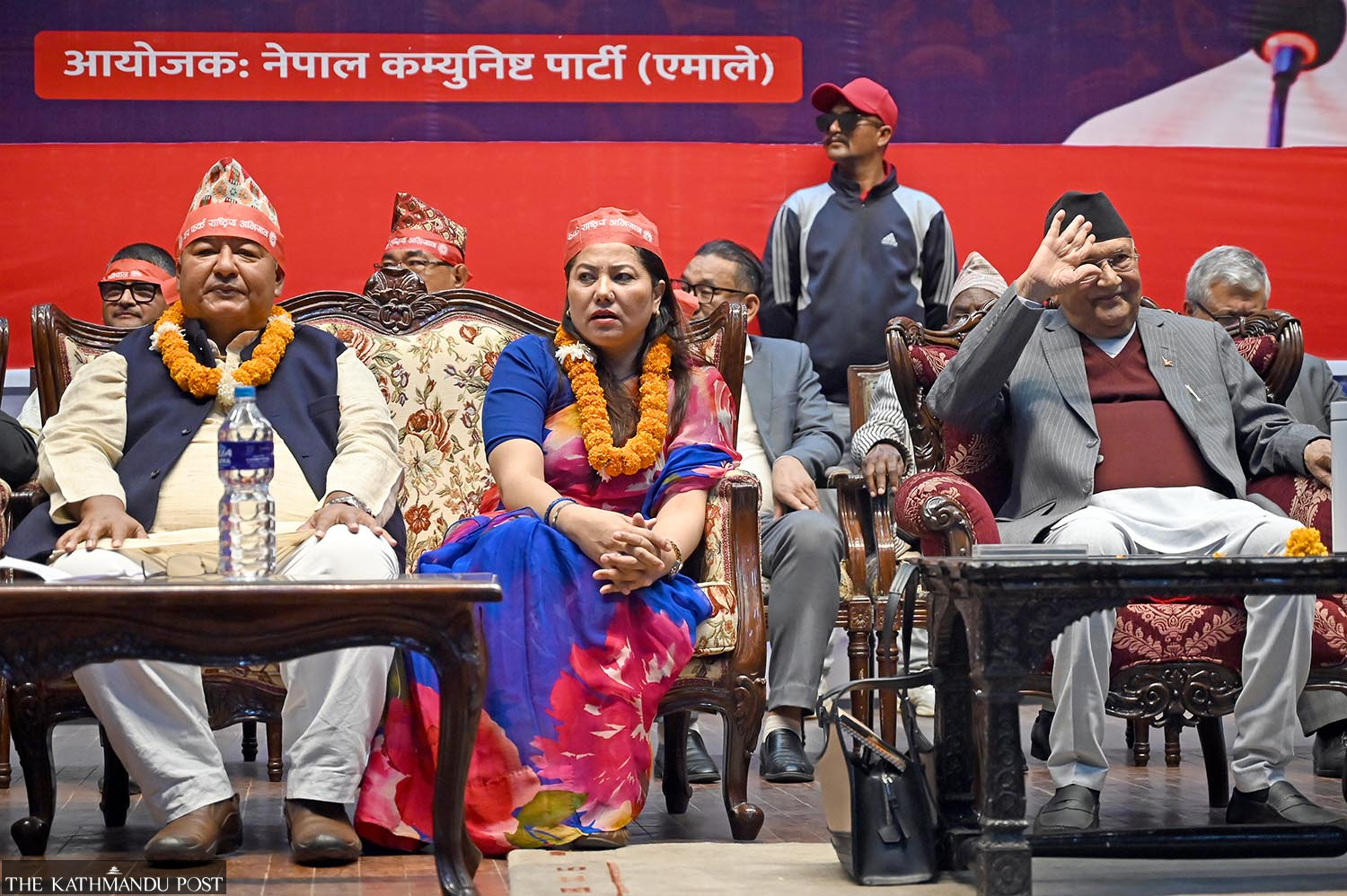 Krishna Kumar Shrestha (left) and Ram Kumari Jhakri (centre) rejoin the CPN-UML amid a function in Kathmandu on Monday. Also seen is UML chair KP Sharma Oli (right). Angad Dhakal/TKP