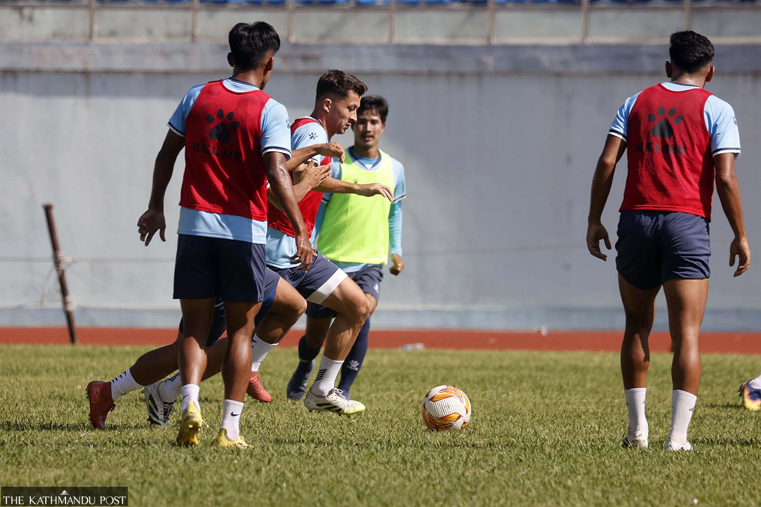 The Nepali men's team is pictured during their training session at Dasharath Stadium in Kathmandu on Monday. They are heading to Bangladesh on Tuesday for a friendly on November 13. The team will then fly to Malaysia for the AFC Asian Cup Qualifiers' match scheduled on November 18. Hemanta Shrestha/TKP