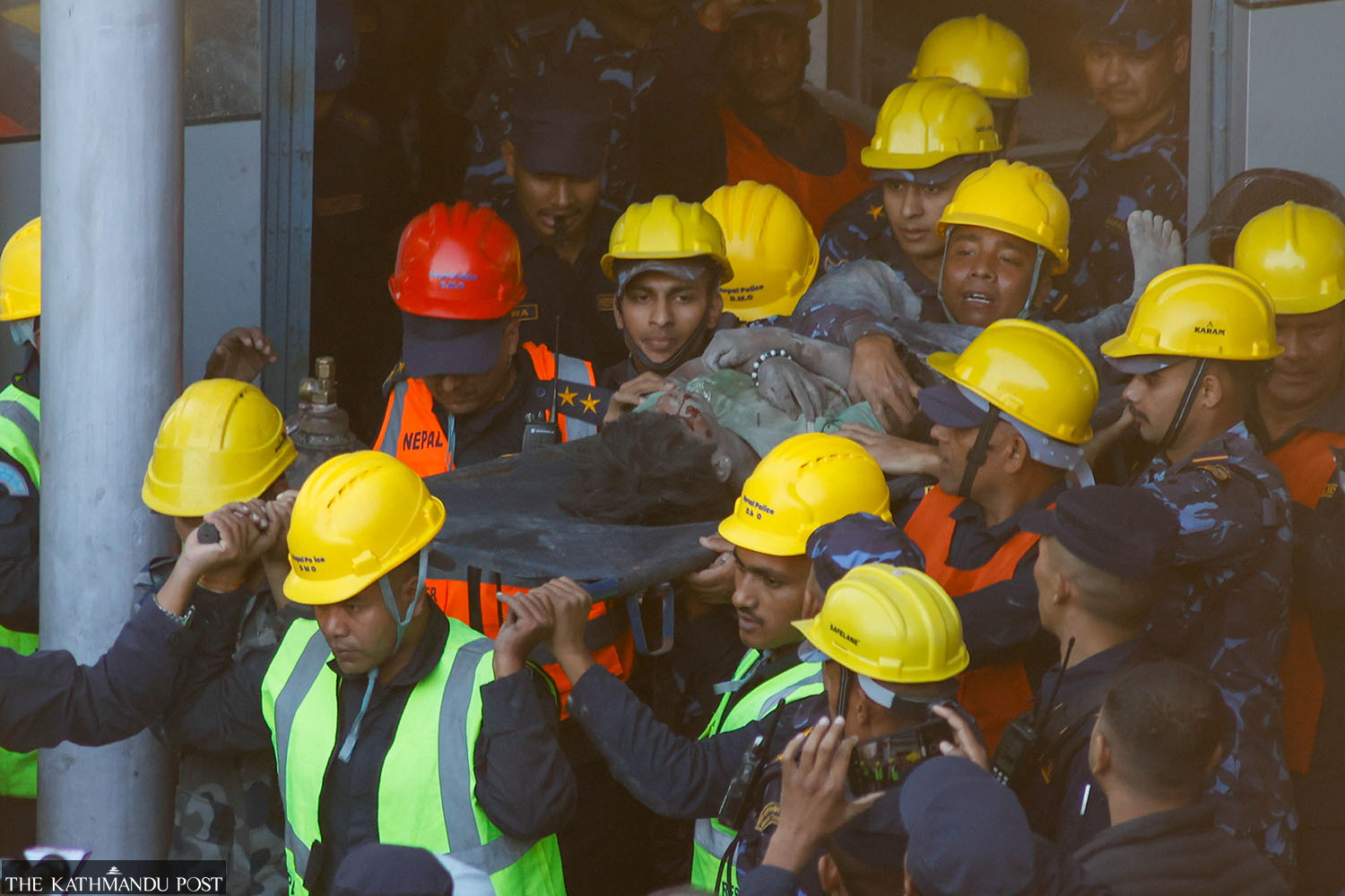 Police rescue a worker injured while demolishing a Bhatbhateni superstore building at Naxal in Kathmandu on Sunday. Rajkumar Syangtan, 33, Dipak Tamang, 25, and Ajaya Pakhrin, 21, were buried under the debris that fell from the building destroyed in arson during September protests. Suryams Upreti/TKP