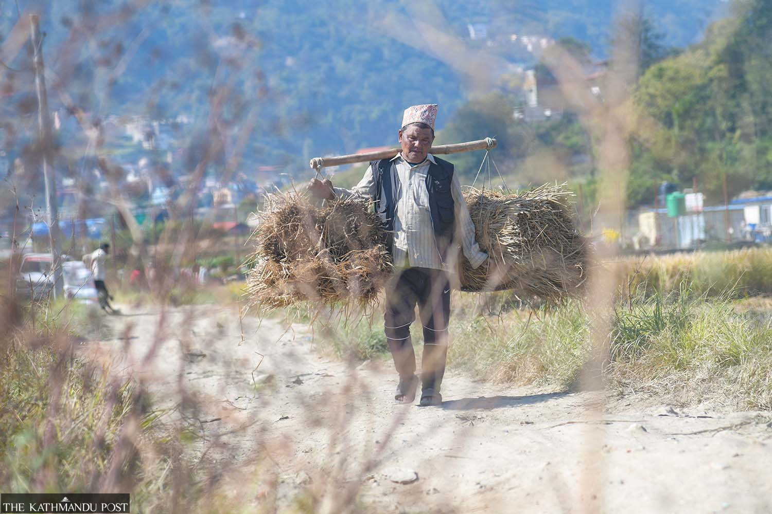A man carries straw in his kharpan, a traditional pole basket, at Khokana, in Lalitpur, on Tuesday Deepak KC/TKP