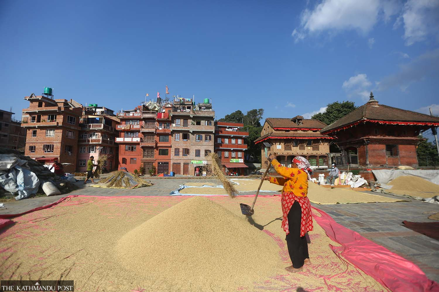 A farmer winnows freshly threshed paddy in Bhaktapur on Friday. Farmers hit by unseasonal rains have resumed paddy harvests across Nepal. Dipen Shrestha/TKP