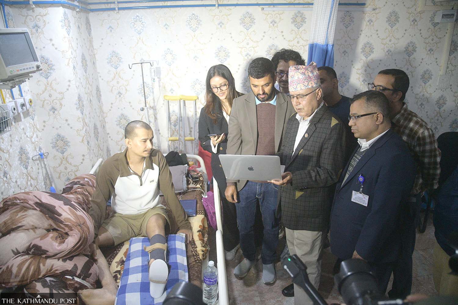 Minister Rameshore Khanal (in cap) visits an injured of the Gen Z uprising, at Trauma Centre in Kathmandu, to issue him a voter ID on Thursday. Deepak KC/TKP