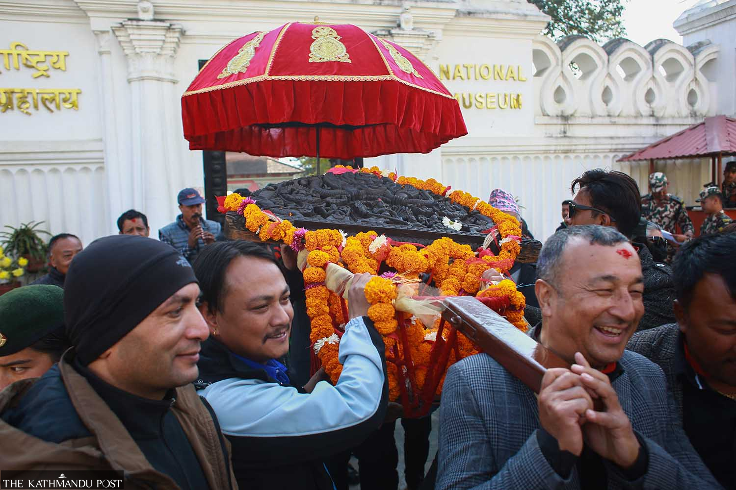 A toran, decorative lintel, which was stolen from the Kumari Ghar Kathmandu 26 years ago, is taken back where it belongs, on Friday. The antique was repatriated from Barakat Gallery, London two years ago and had been kept at the National Museum, Chhauni. Dipen Shrestha/TKP