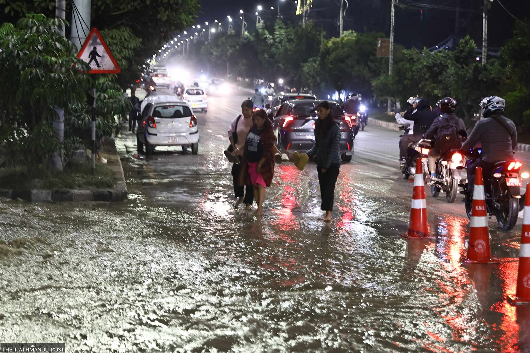 People negotiate a flooded road after a water pipe main burst at Minbhawan, Kathmandu, on Saturday evening. Post Photo