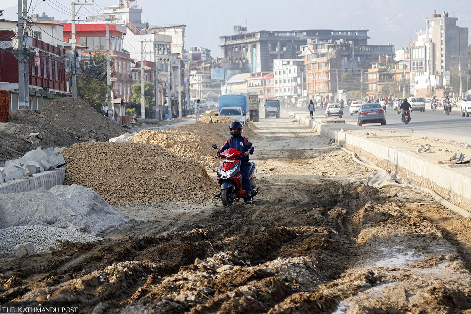 A scooter picks its way through the mud on the under construction widened section of the Ring Road near Dhumbarahi, Kathmandu on Sunday. After long delay, work to expand the four-lane road to eight lanes in this section began a few months ago. Suryams Upreti/TKP