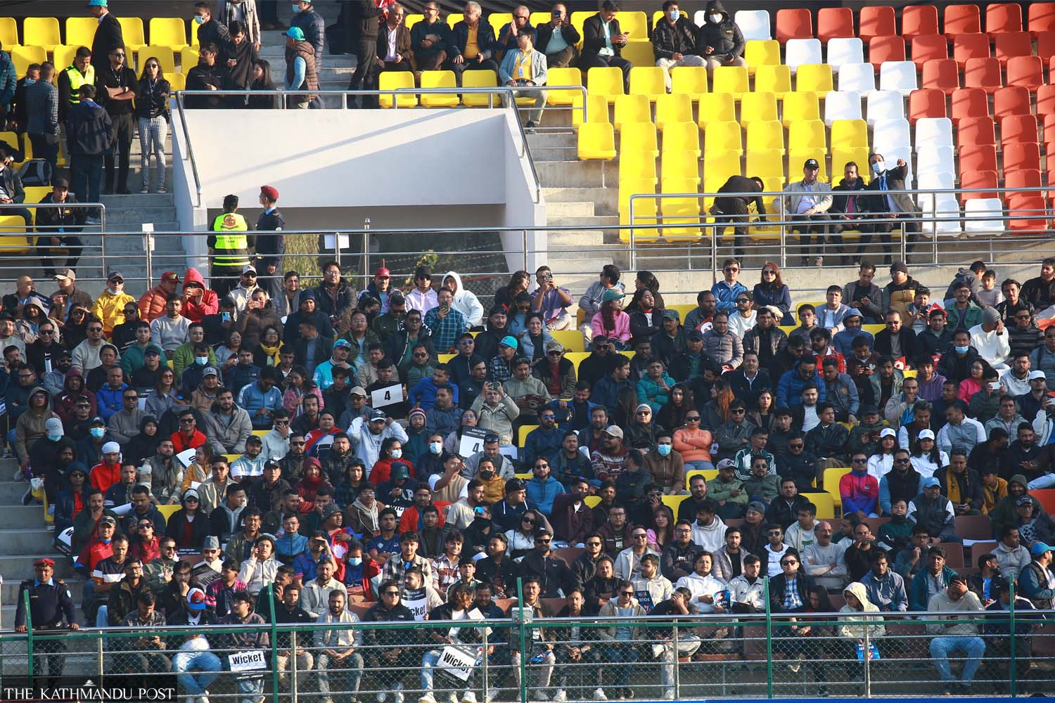 Spectators pack the grandstands at the TU International Cricket Stadium in Kirtipur on Monday afternoon during the Nepal Premier League opener between Kathmandu Gorkhas and JanakpurBolts. Kathmandu Gorkhas beat the defending champions by five wickets. Hemanta Shrestha/TKP