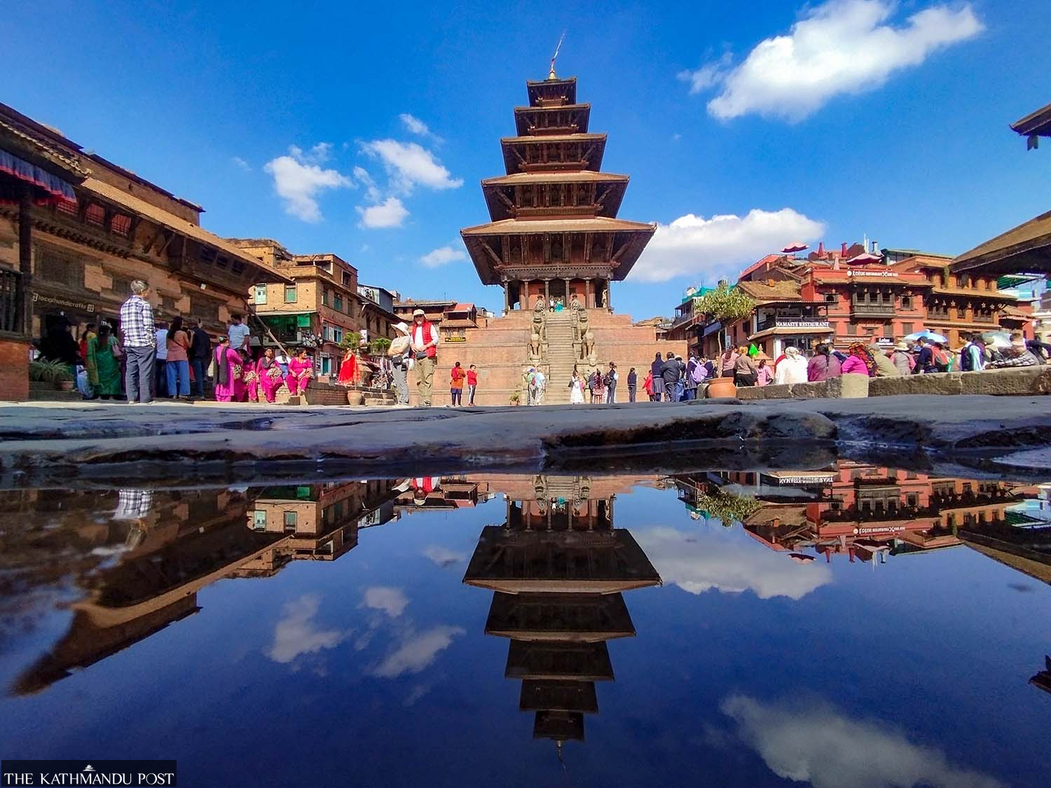 A reflection seen in a pool of water formed in front of the Nyatapola temple in Bhaktapur on Sunday. Deepak KC/TKP