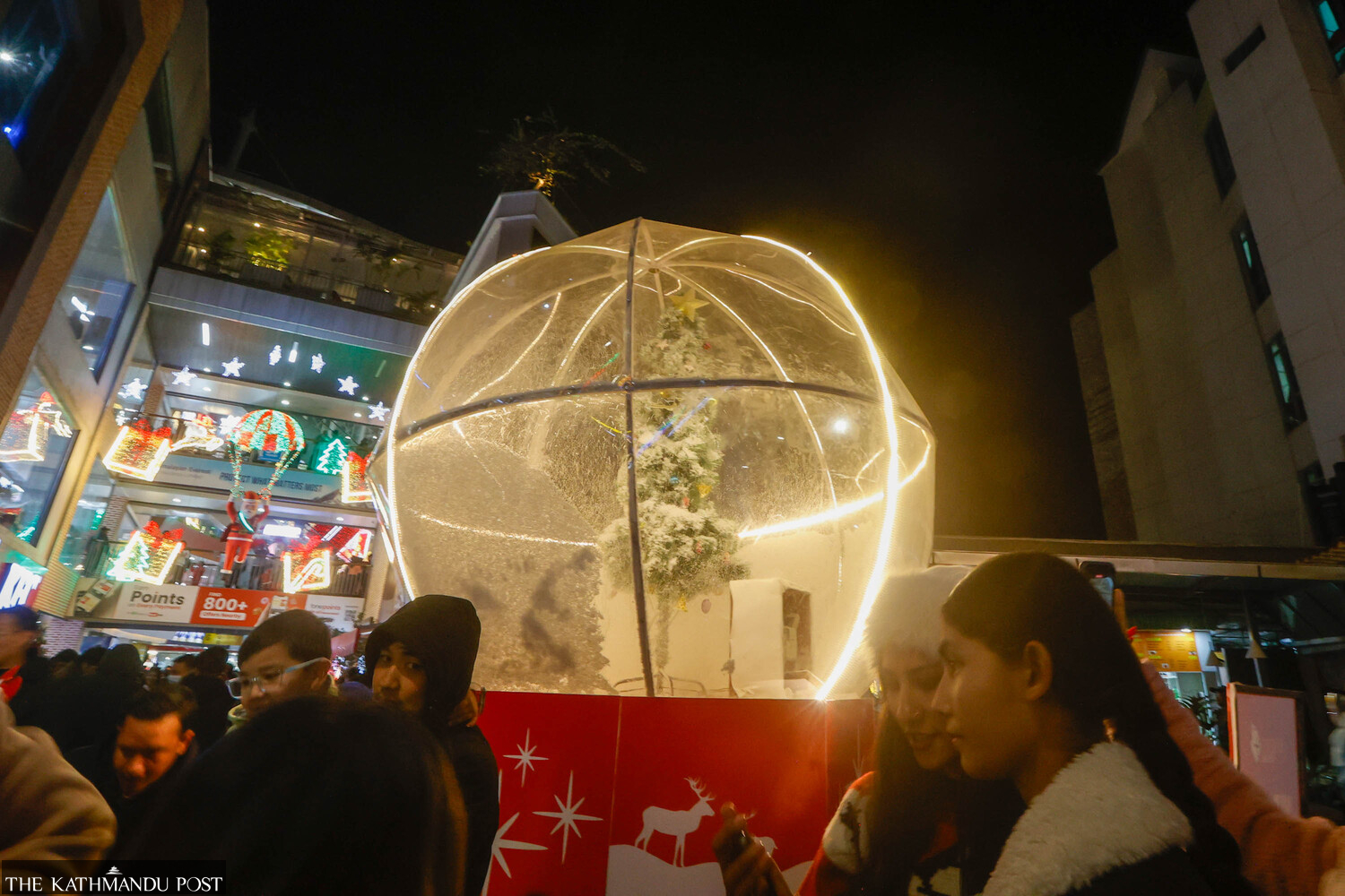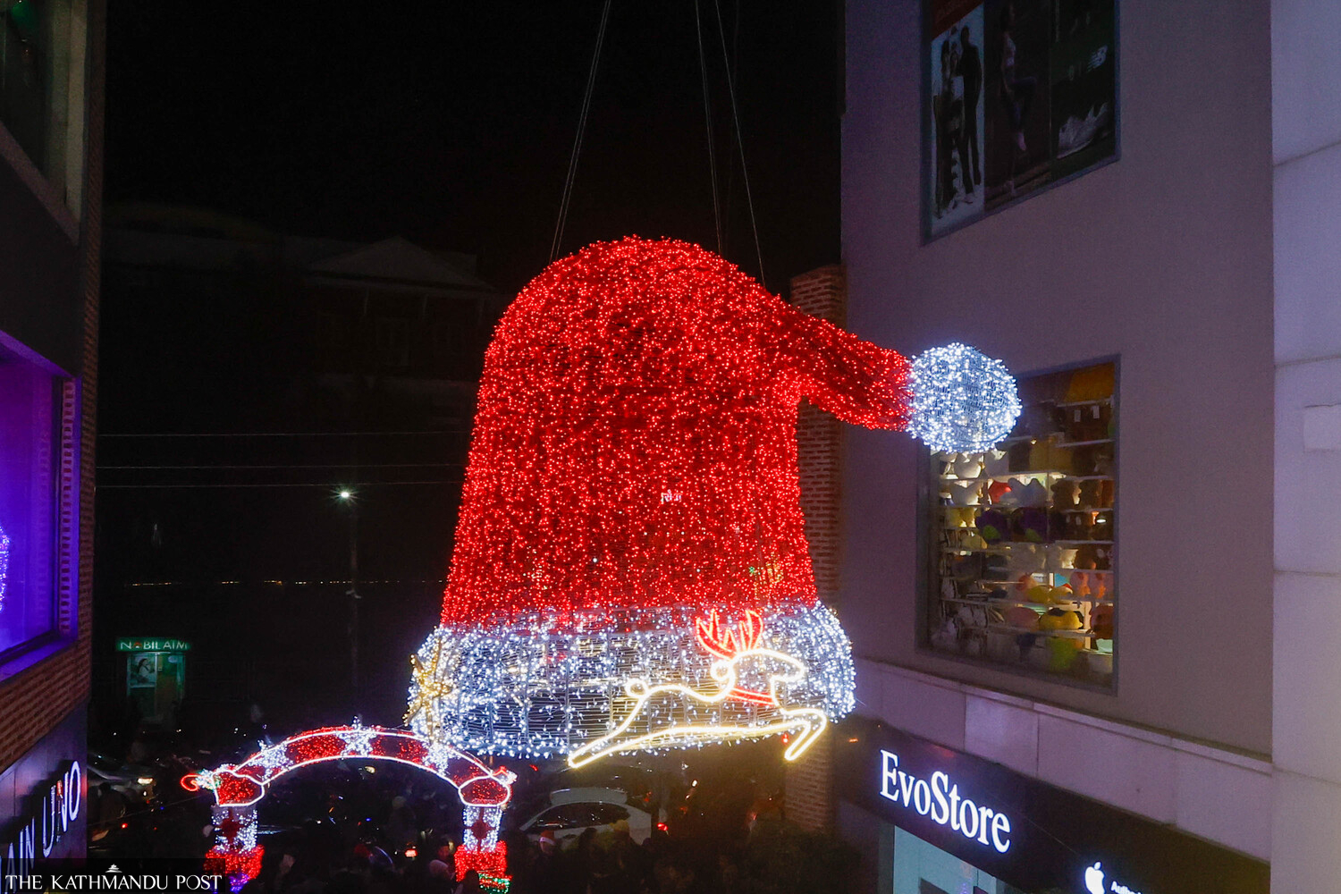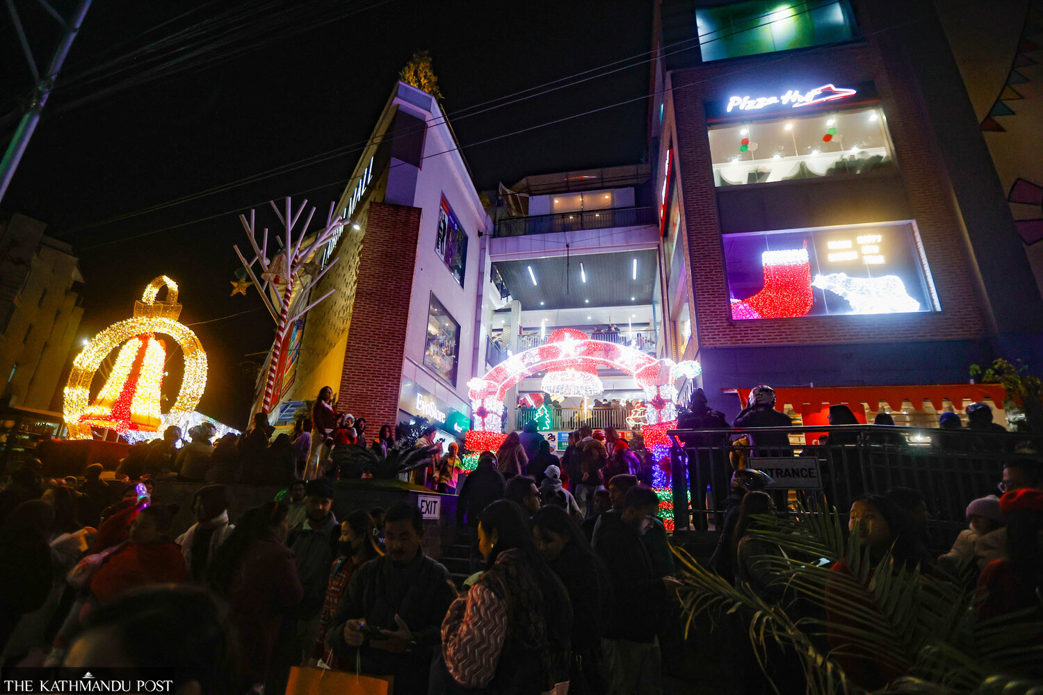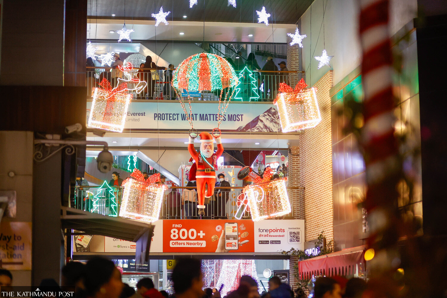 The mall was lit up with large decorative installations, including a glowing bell and a Santa Claus figure. The area remained packed, with visitors arriving from different parts of the Kathmandu Valley even on a chilly evening.