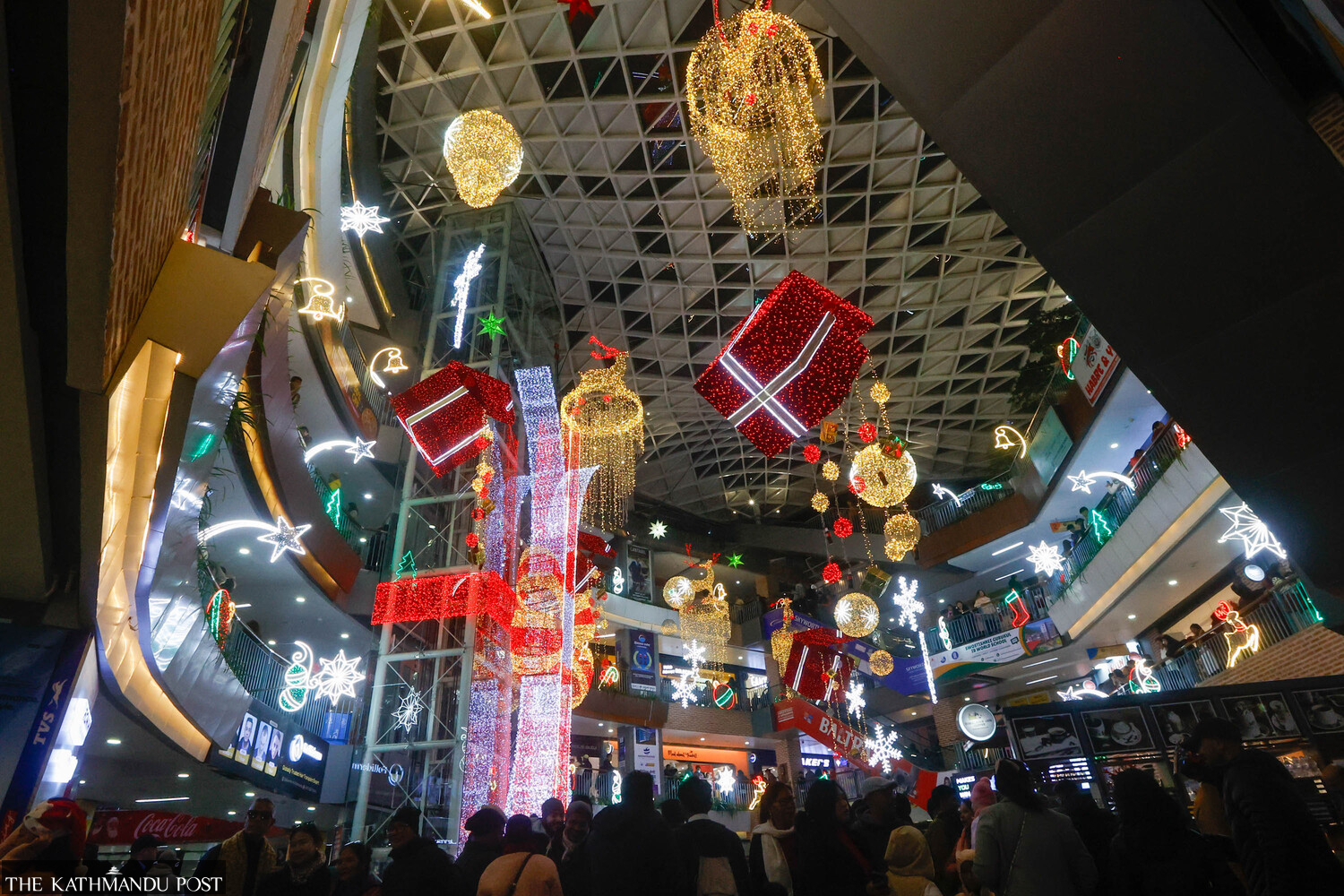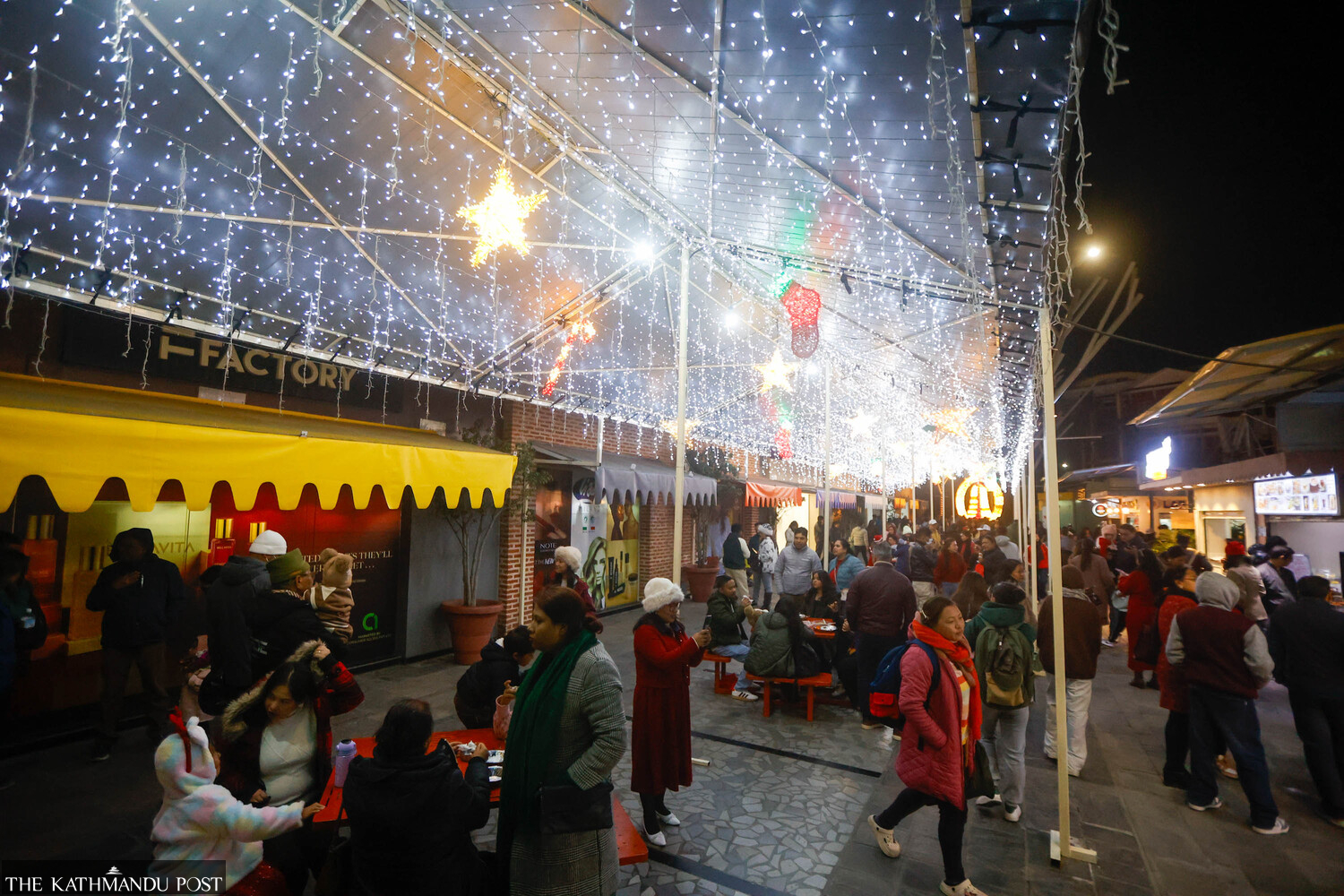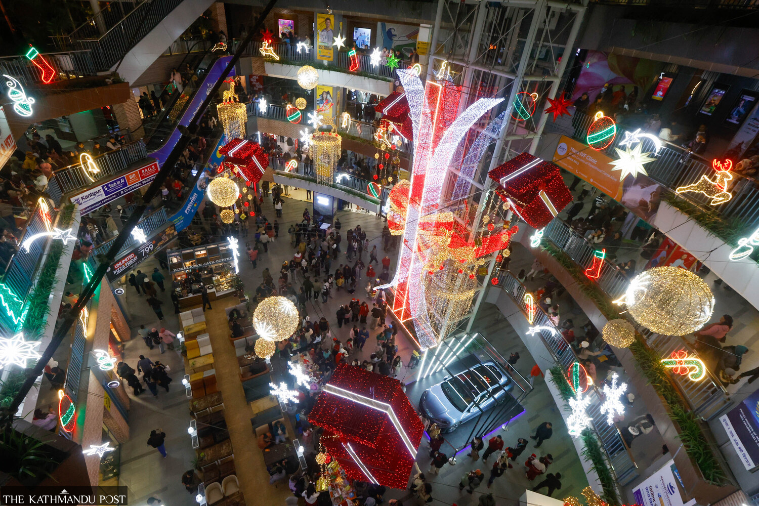 Festive lights attract crowds to the Lalitpur-based mall despite winter chill.