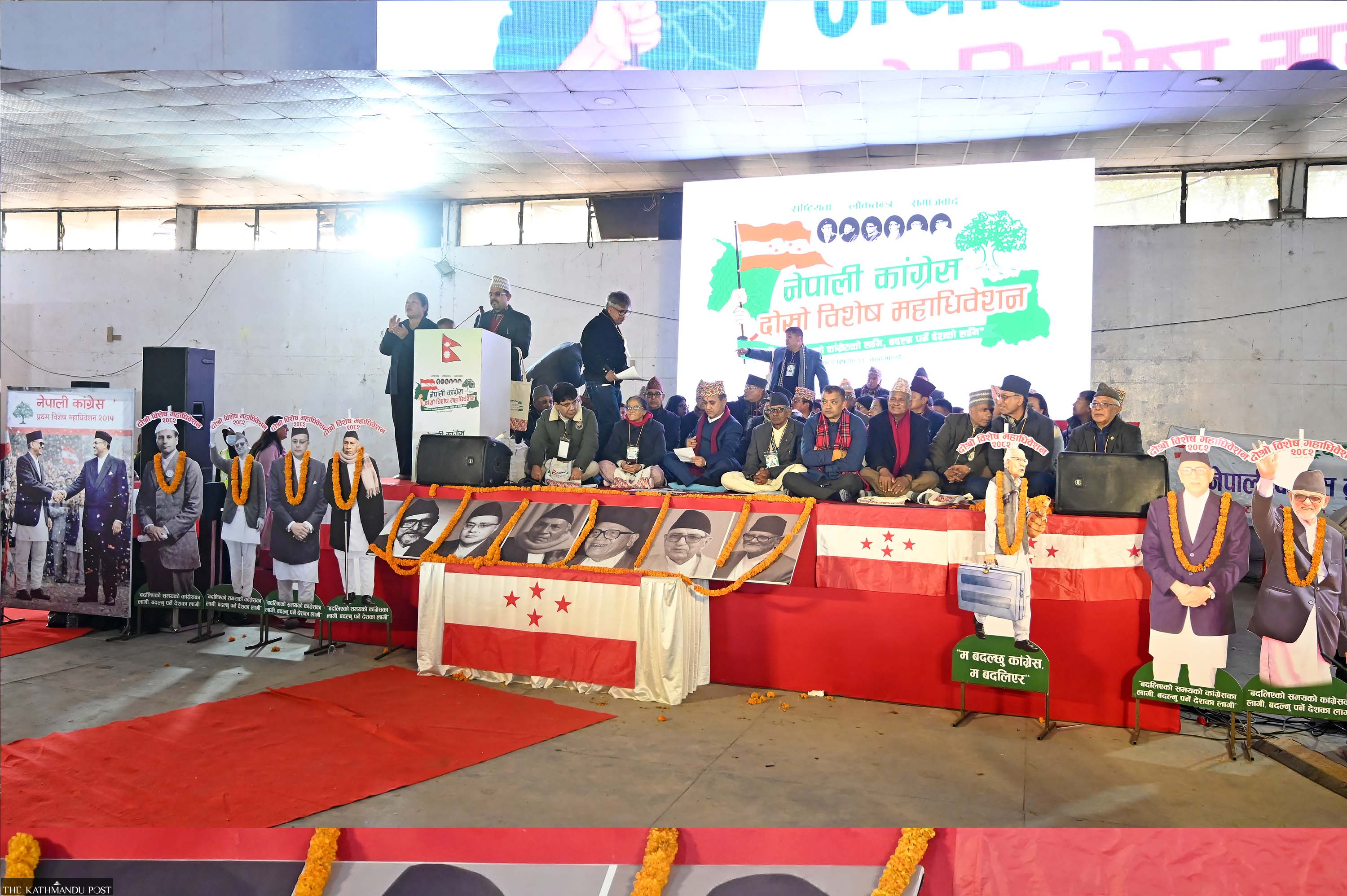 Congress leaders at the closed-door session of the party’s special general convention at Bhrikutimandap, Kathmandu, on Monday morning. Angad Dhakal/TKP