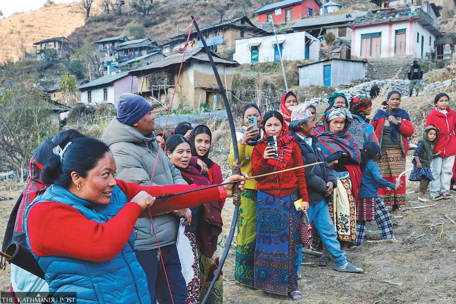 A woman aims an arrow during the Taro Hanne game held every year in Thawang Gaun of Rolpa on the occasion of Maghe Sankranti, Thursday. Post Photo: Hemanta Shrestha