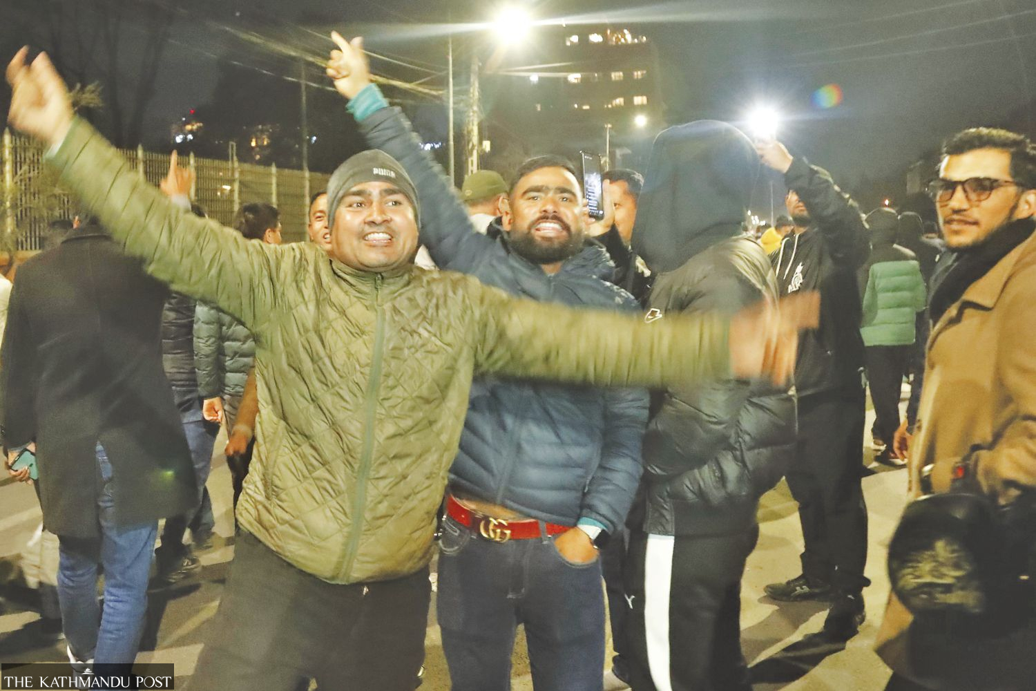 Nepali Congress cadres celebrate outside the Election Commission in Kantipath, Kathmandu on Friday evening, after the Gagan Thapa‐led faction was recognised as the legitimate Nepali Congress, ending a long-running dispute with the Sher Bahadur Deuba faction. Post Photo: Deepak KC