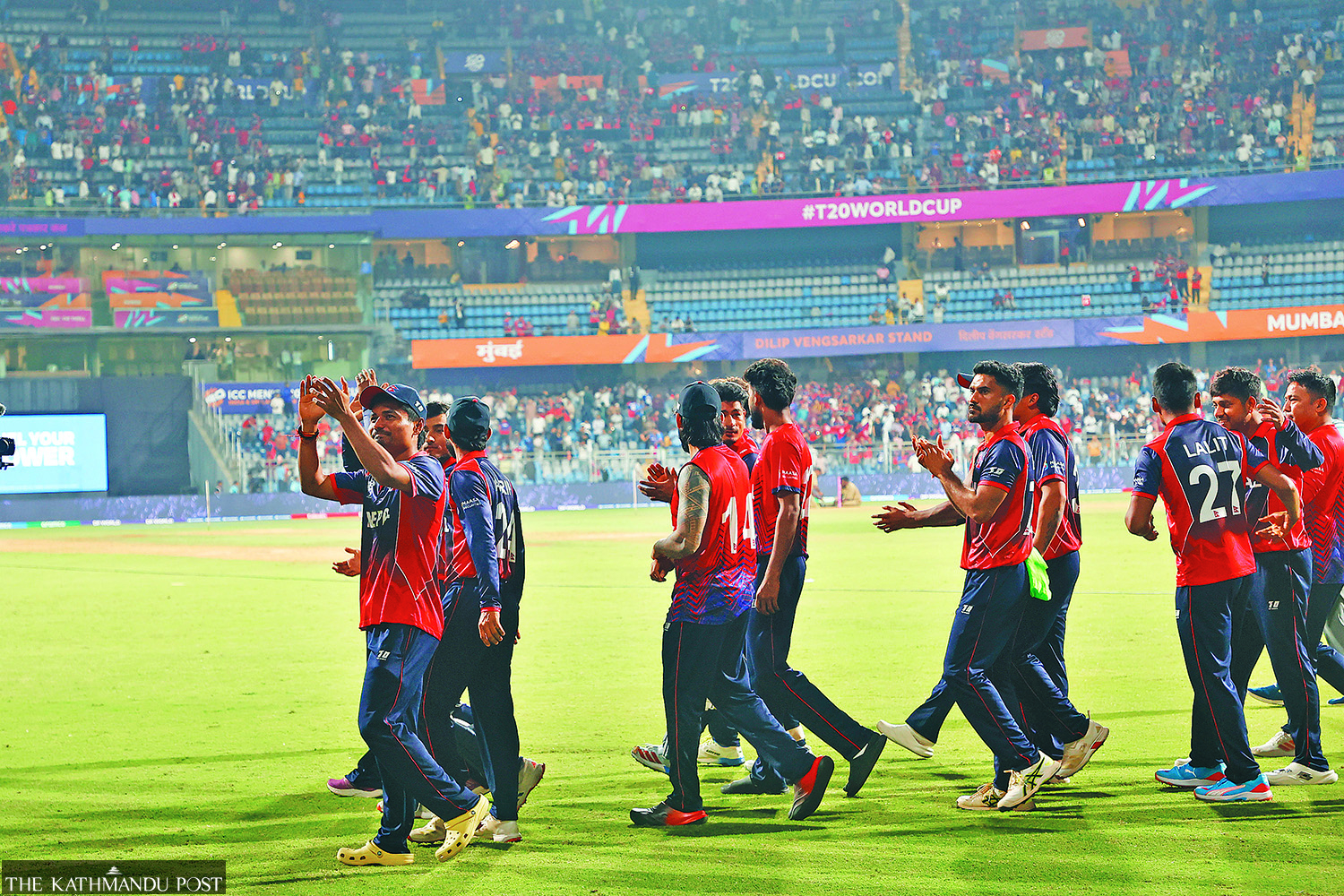Members of the Nepali cricket team applaud fans after beating Scotland by seven wickets in their last match of the ICC T20 WorldCup at Wankhede Stadium in Mumbai, India, on Tuesday. Hemanta Shrestha/TKP