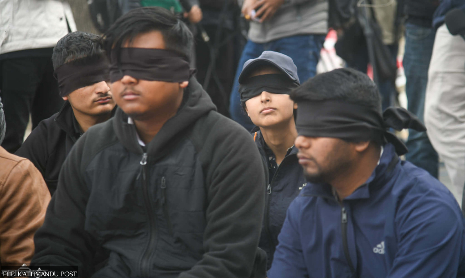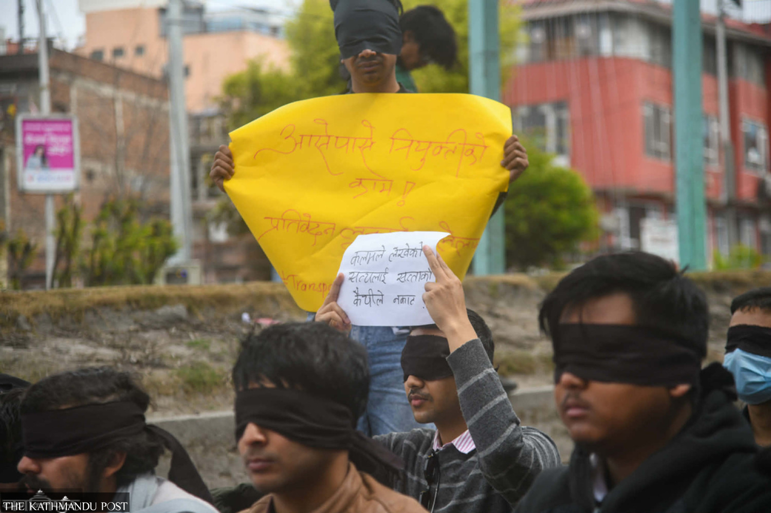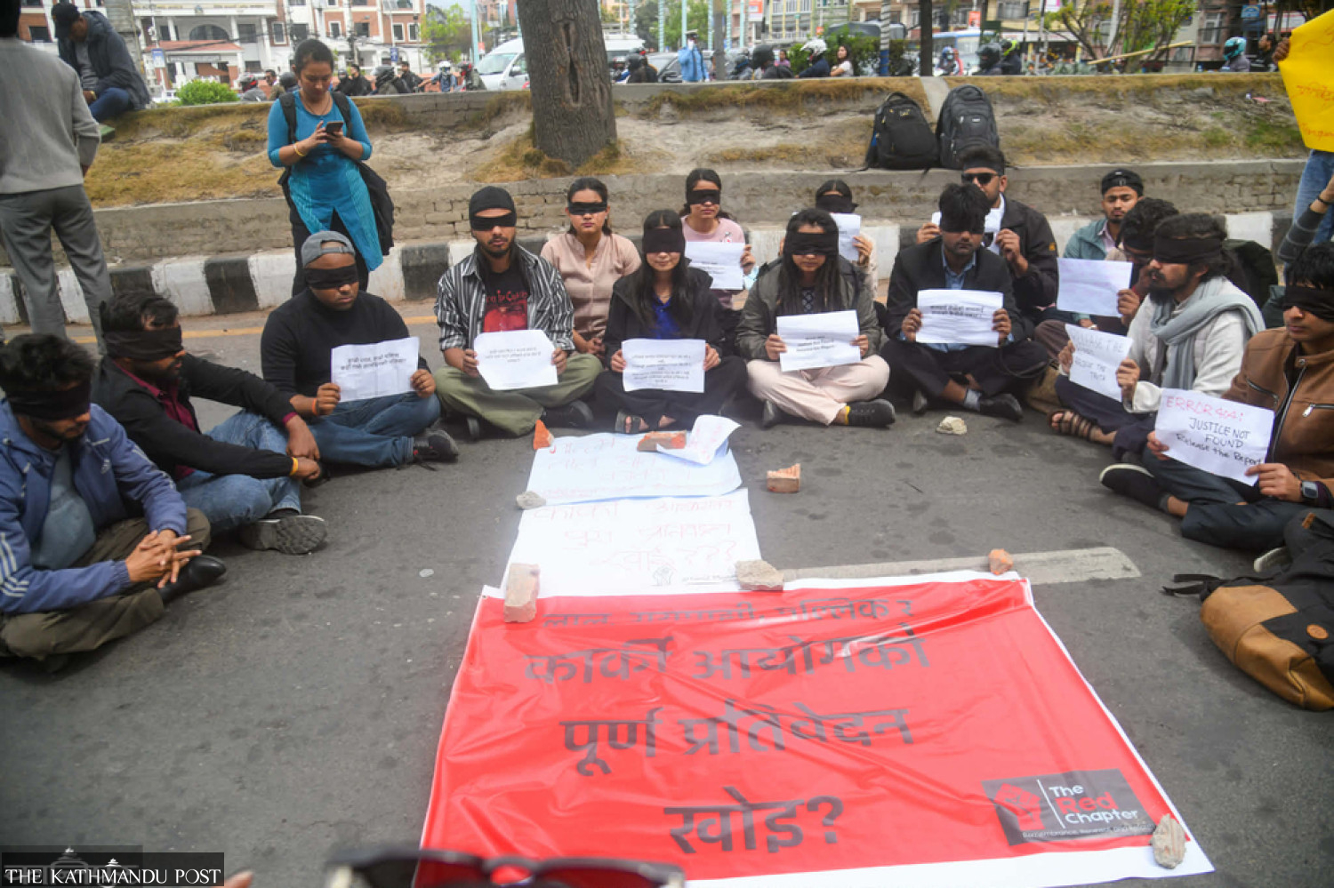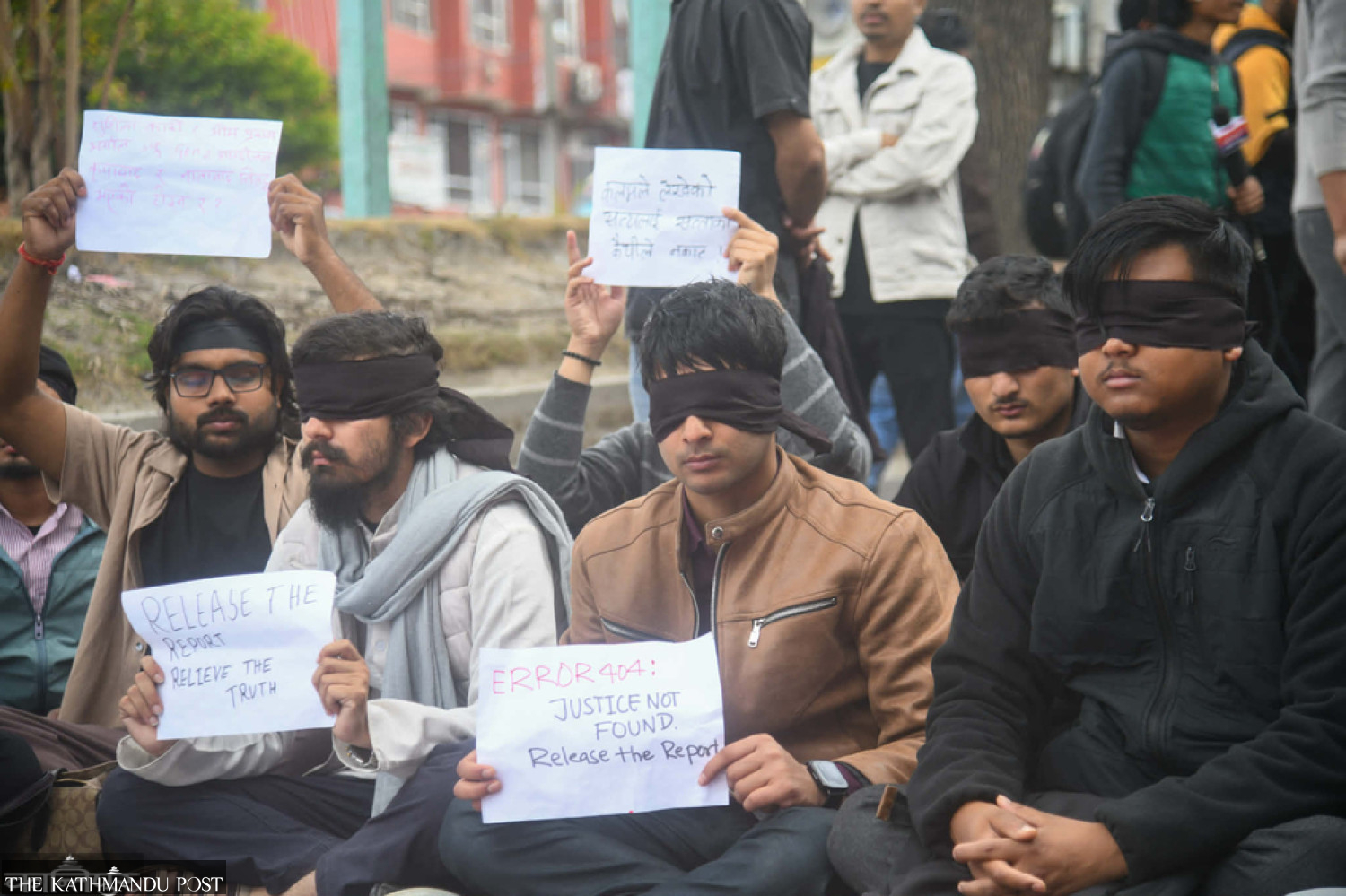 Protesters displayed placards with slogans such as “Where is the full report of the Karki commission?”, “Don't let the weight of the state crush the truth of the pen,” and “Error 404: Justice not found. Release the report.” Some demonstrators also wore black blindfolds.