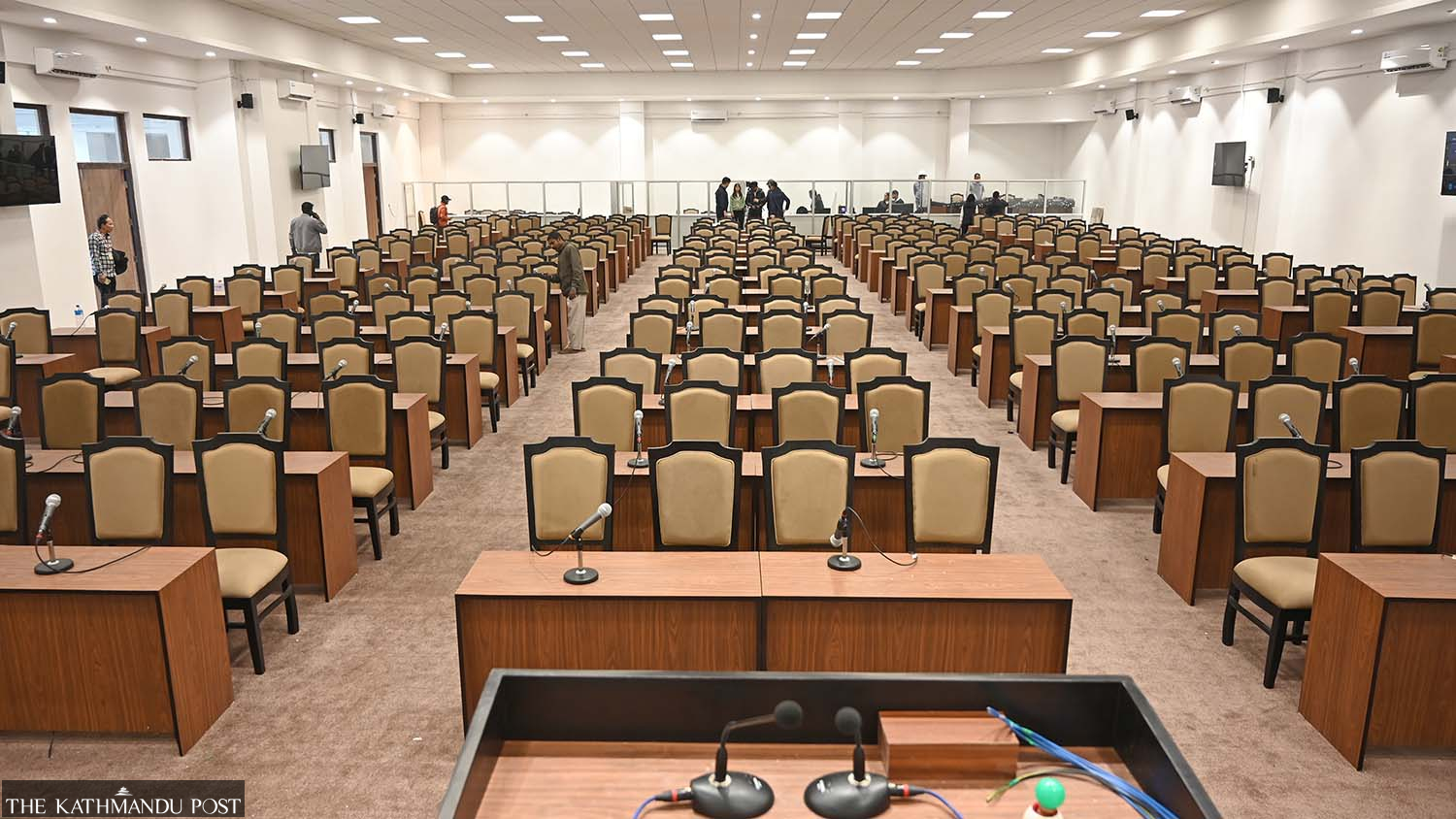 This is the hall at the under-construction parliament building in Singha Durbar, where new lawmakers will take their oath on Thursday. Since the federal parliament building at New Baneshwar was gutted during the Gen Z protest on September 9, the ceremony will be held in this ‘multi-purpose hall’ while the main building is still under construction. Officials are seen in the background inspecting the venue on Monday. Angad Dhakal/TKP