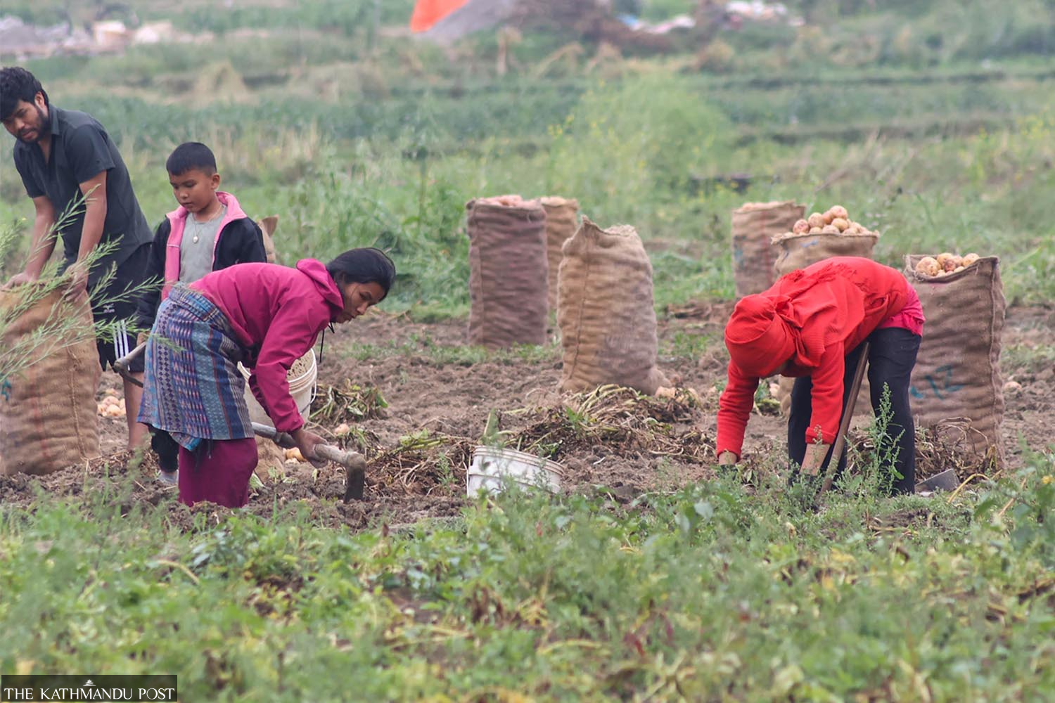 Farmers are busy harvesting potatoes at a farm in Raviopi village in Kavrepalanchok, on Saturday. The crop was planted about four months ago. Suryams Upreti/TKP