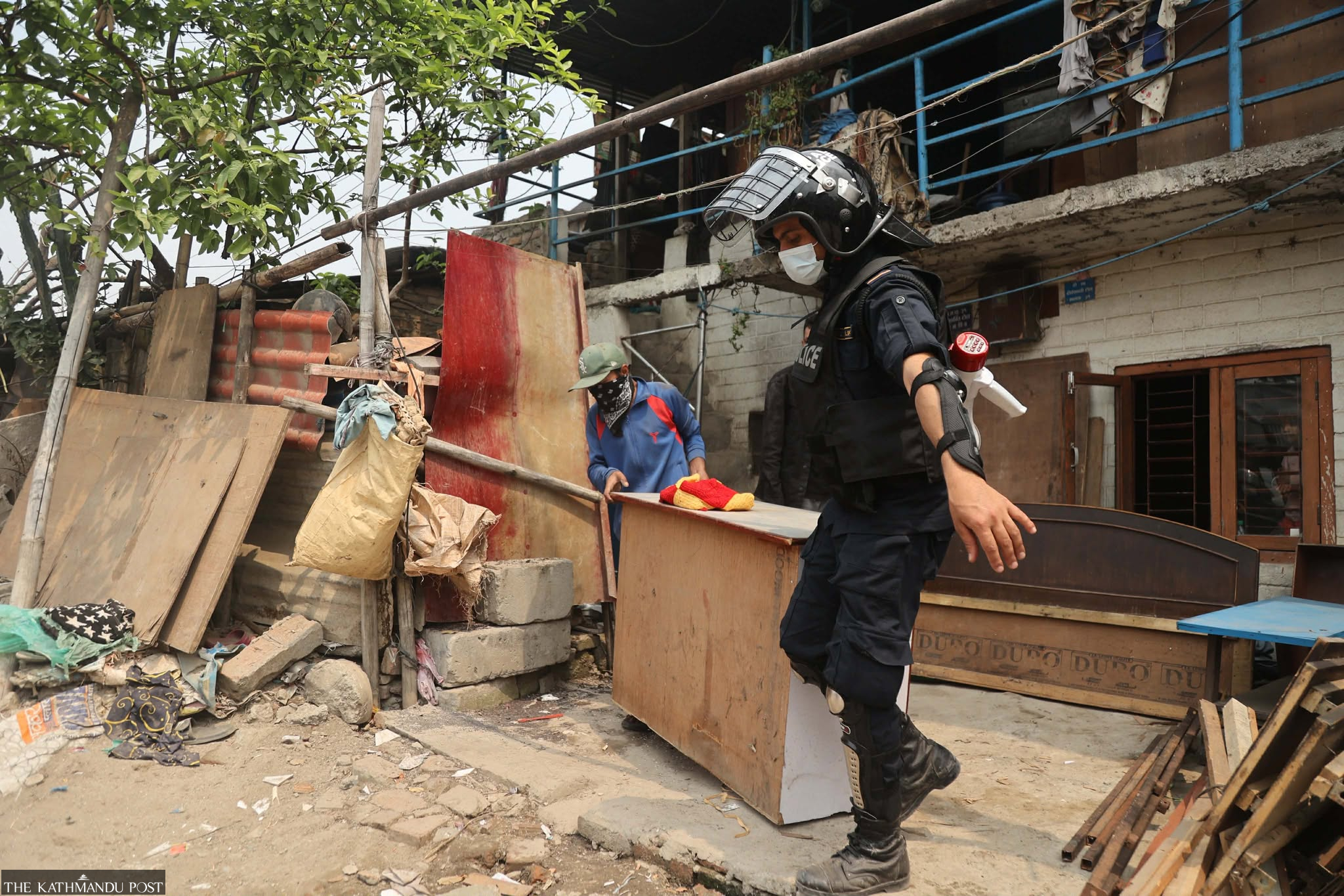 Police and Armed Police Force personnel moved door to door, urging remaining residents to vacate. Access for journalists was restricted as the demolition progressed.