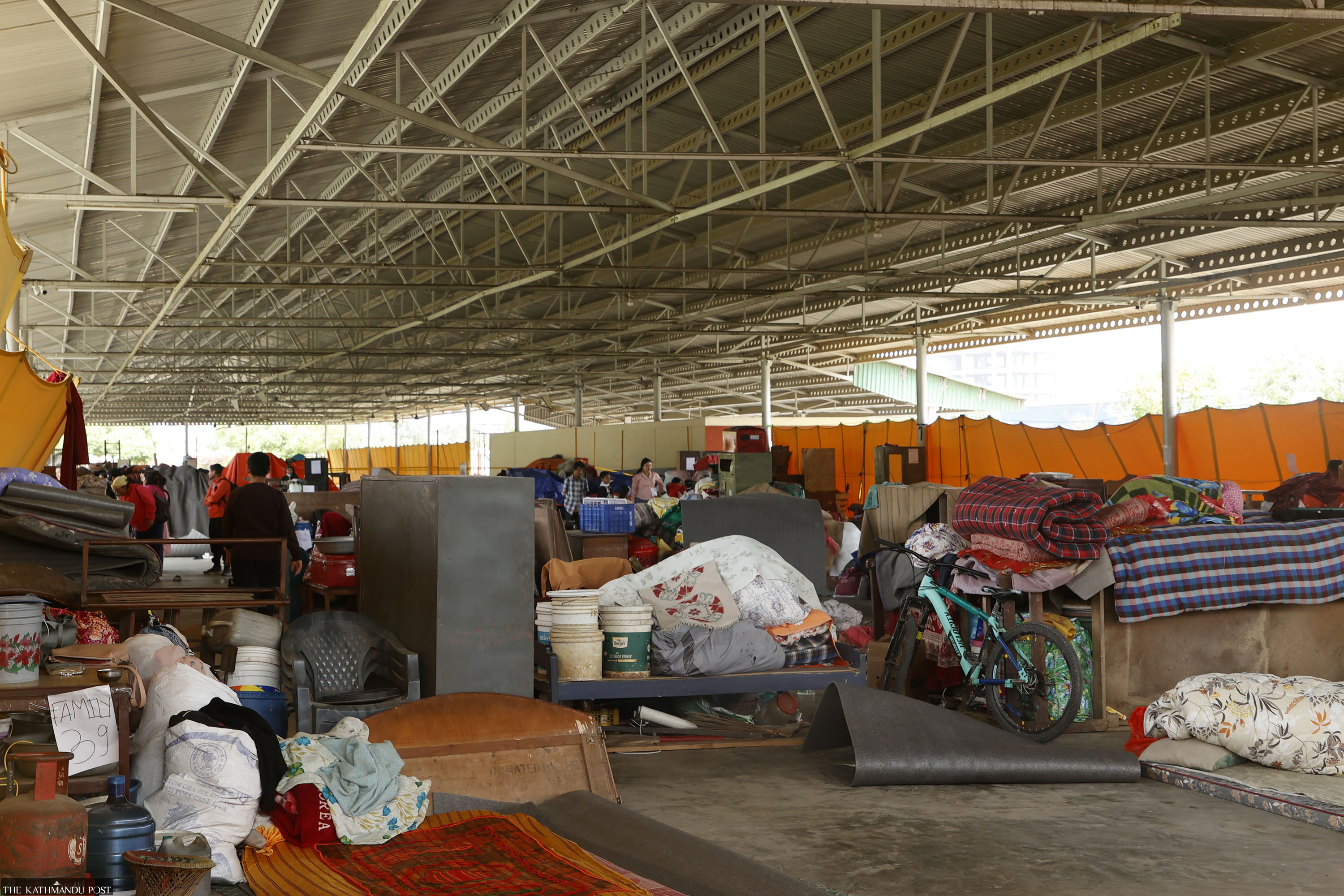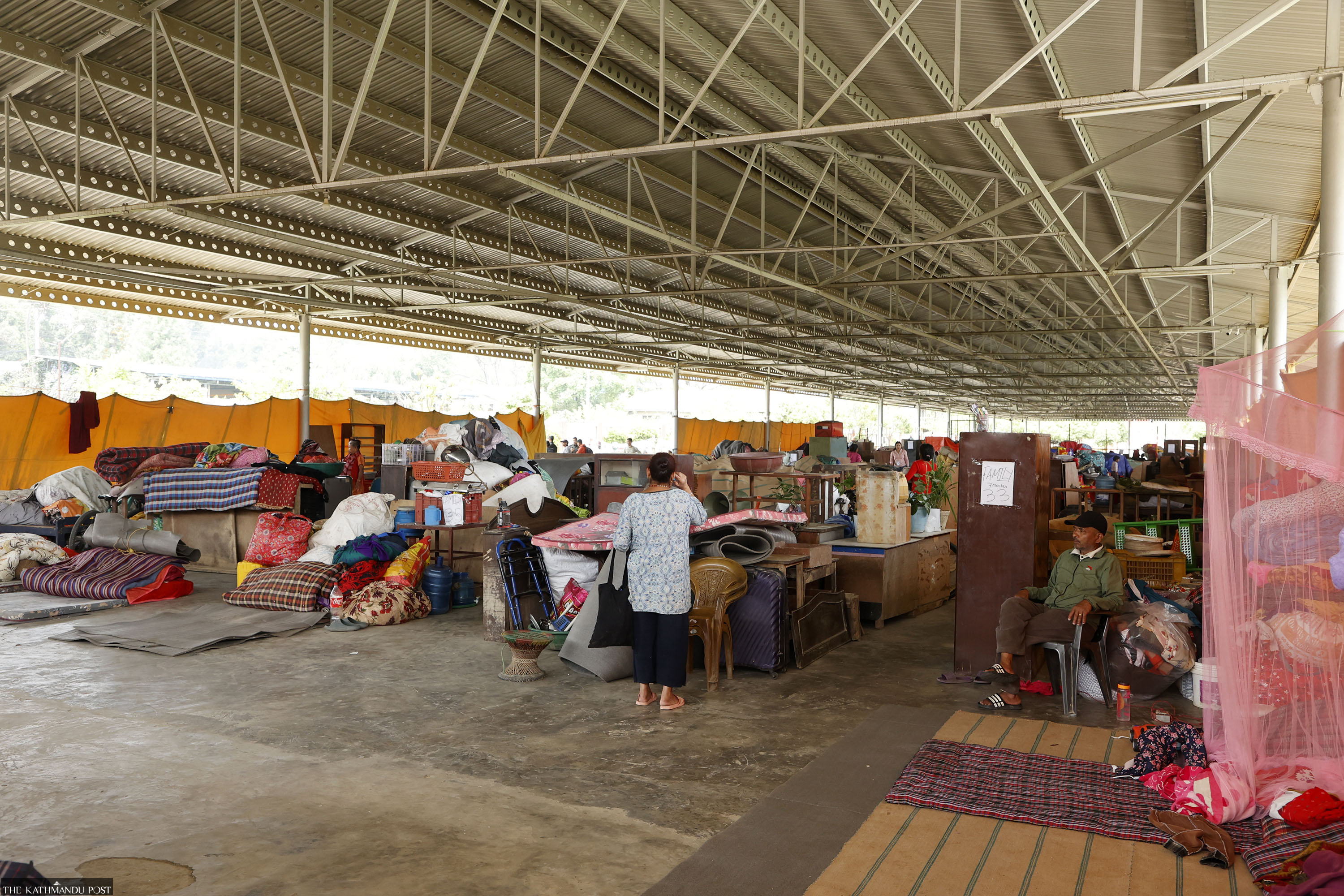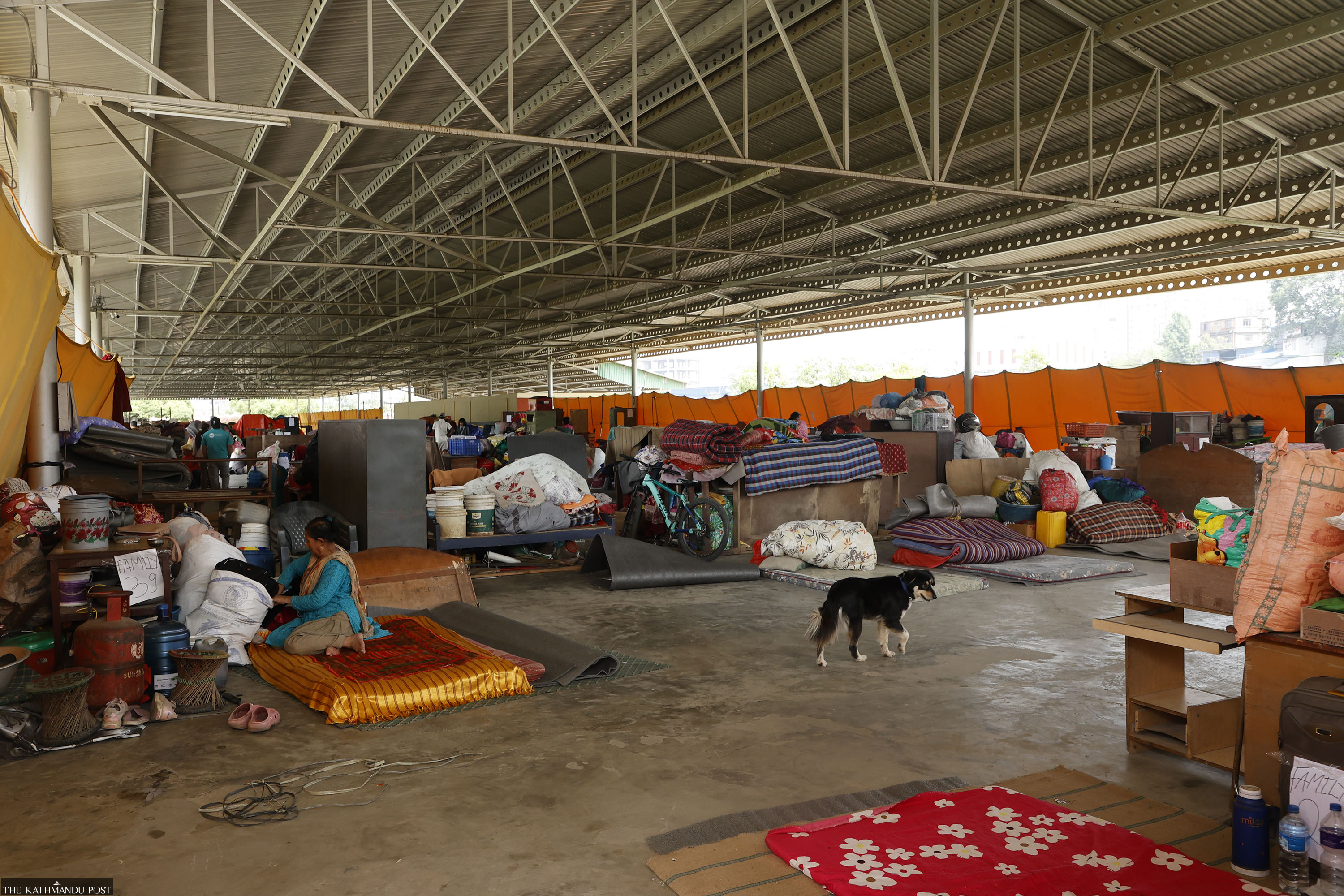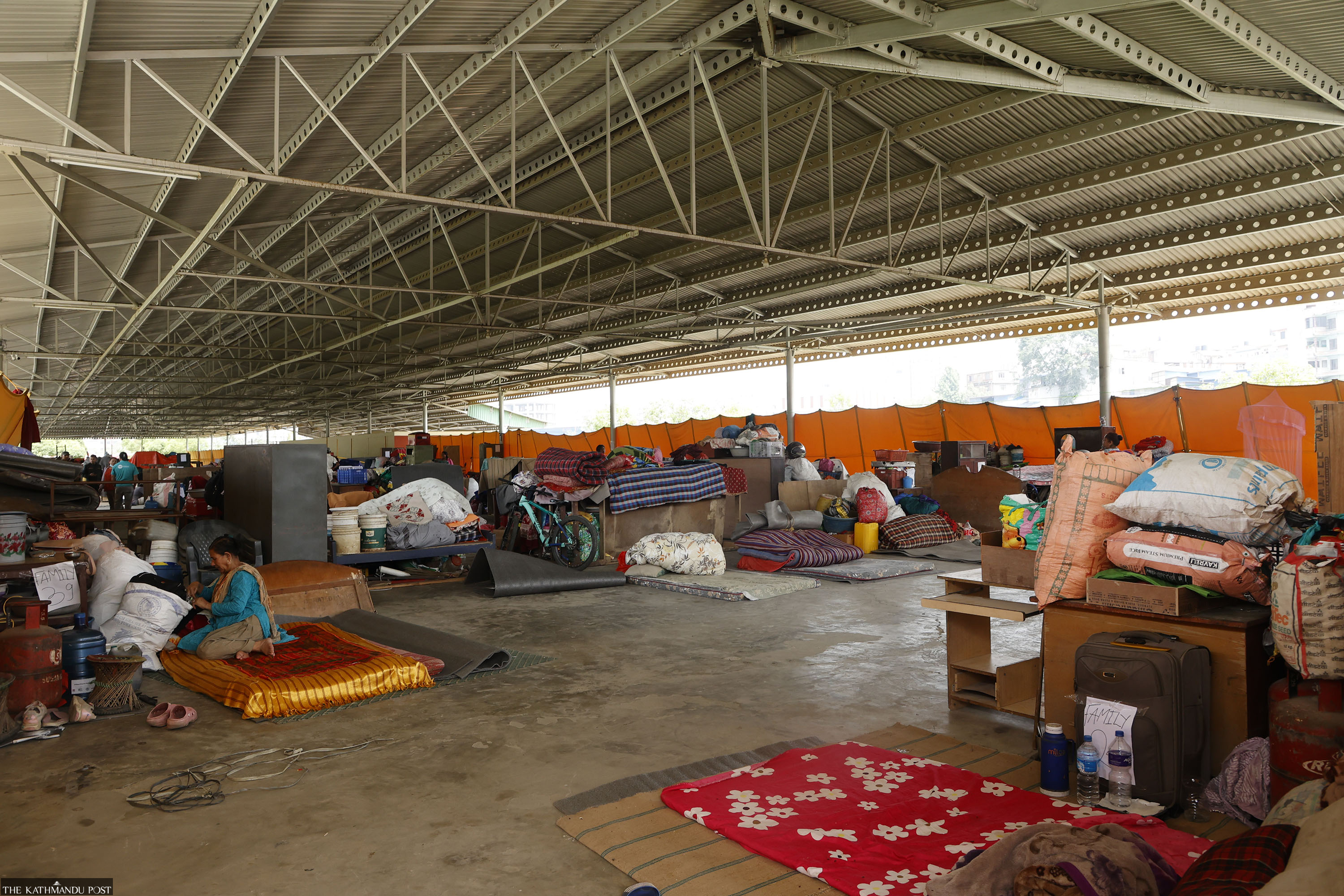 The shelter is a roofed structure made of corrugated sheets but without walls. Inside, there are no partitions separating families or sleeping areas. A partial fabric barrier outside offers limited cover. Some residents said the lack of privacy was a concern.