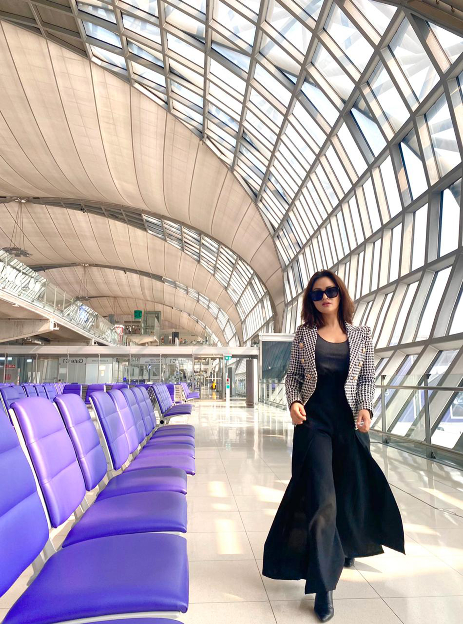 Sandhya KC was spotted at Suvarnabhumi airport looking super chic. She hasn’t compromised in comfort or style with her flared slit trousers and a basic tee. Her comfortable boots give her all the freedom to rush from one departure gate to the other while her structured blazer keeps her safe from the controlled temperature inside the airport. “I like to be comfortable during flights and these pants are the most comfortable pair I have,” she said.