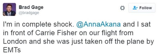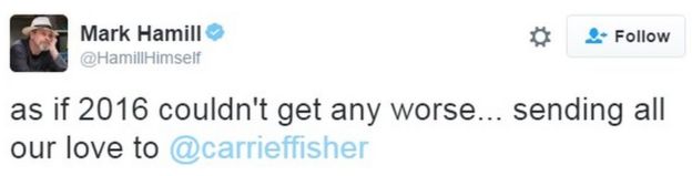Mark Hamill, who played Luke Skywalker, said he was sending all his love and Peter Mayhew, who played Chewbacca, tweeted his thoughts and prayers for "everyone's favourite princess".