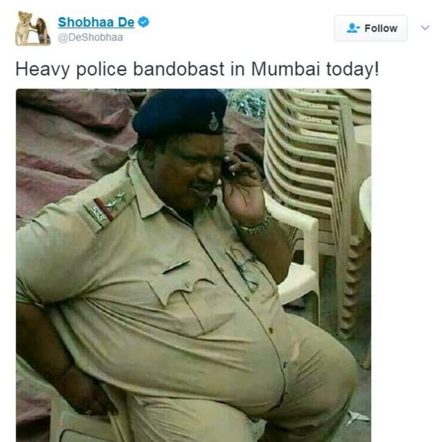 The writer had tweeted a picture of Mr Jogawat last month, saying the police in Mumbai had planned "heavy security" for local elections.