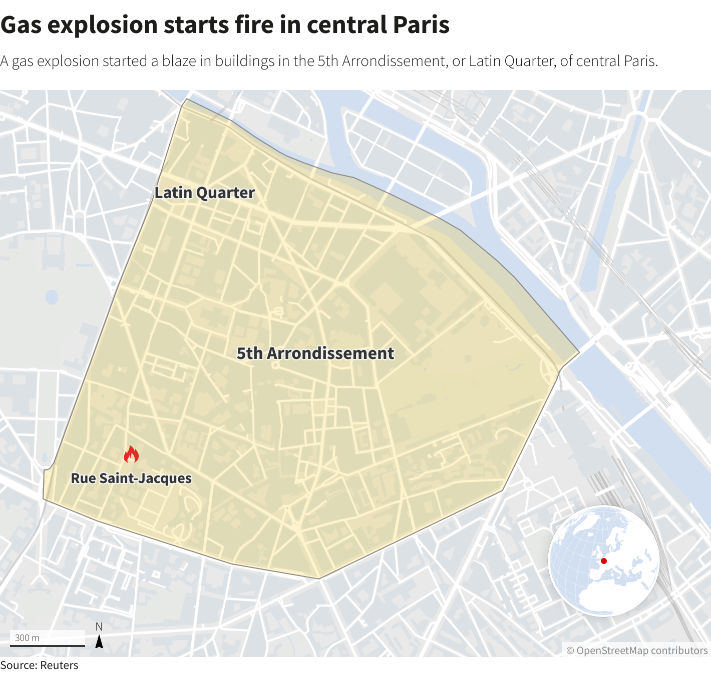 The explosion tore through Rue Saint-Jacques, which runs from the Notre-Dame de Paris Cathedral to the Sorbonne University.Reuters