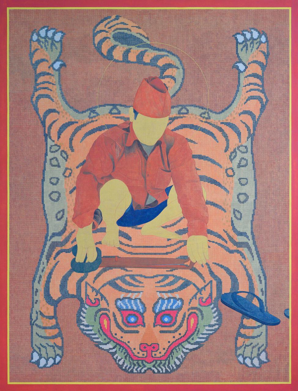 In ‘The Master II’, familiar carpet symbols: cloud forms, hashtag-like patterns, geometric frames—appear across the composition. The gold pigment adds luminosity without opulence, creating a subtle contrast that evokes the spiritual discipline of Thangka painting. Lama’s technical precision merges with documentary intent; the painting becomes a study in how repetitive gestures produce both pattern and meaning.